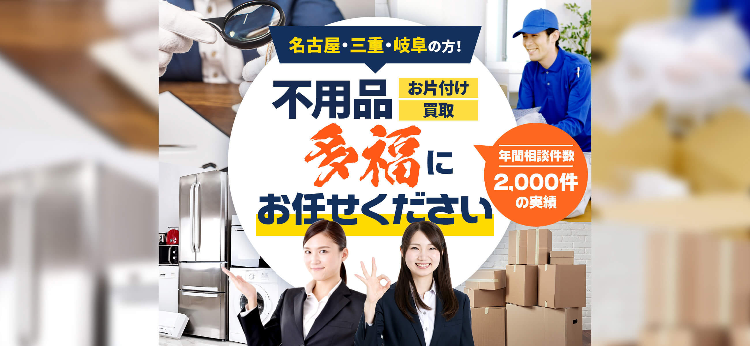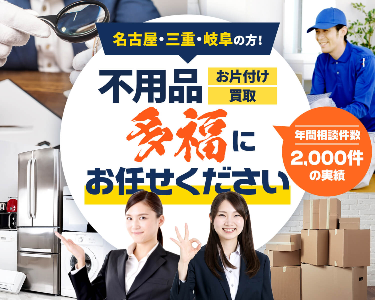 家電買取、ピアノ、お酒、ミシン、おもちゃ、切手、硬化、貴金属ブランド品、カメラ、オーディオ、iPhone、iPad、釣り具などの不用品のお片付け、不用品買取は「多福」にお任せください。電話一本であなたのご自宅まで出張させていただき、相談、鑑定、見積書まですべて無料で対応致します。また、単身の引っ越しも合わせて行うことができます。対応エリアは名古屋を中心とした、愛知、岐阜、三重の東海三県となりますのでお気軽にお問い合わせください。